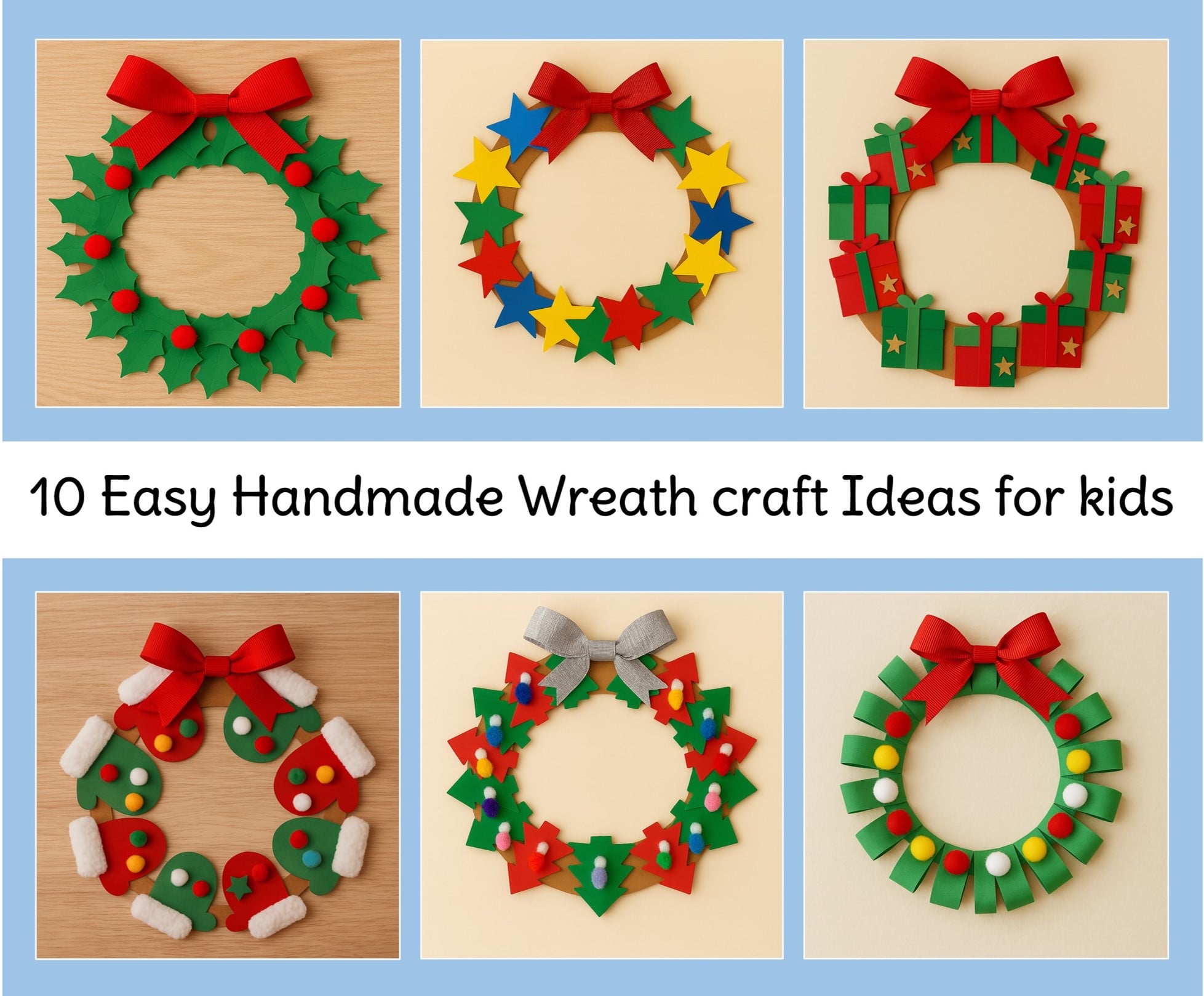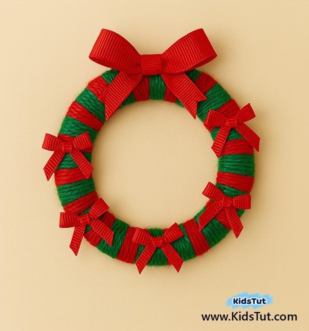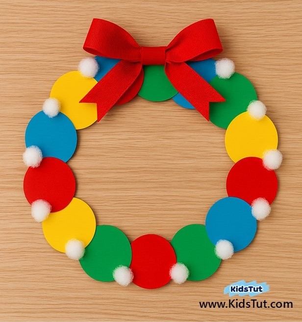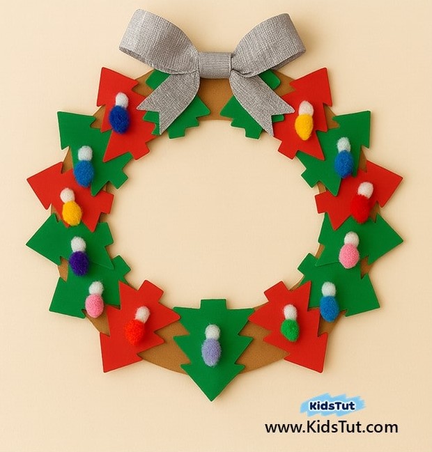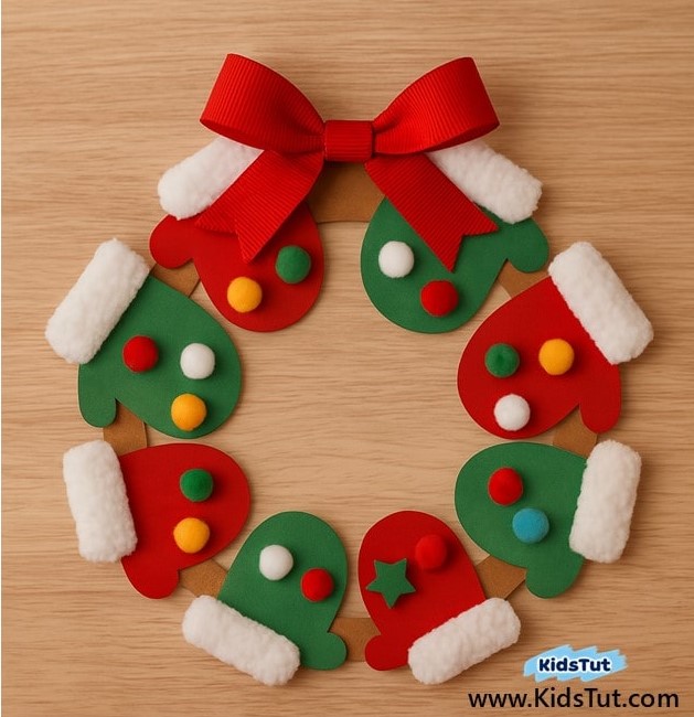 - Step 06: Take colorful pom-pom balls and paste them on your mittens. Step 07: Finally, make a bow from ribbon and paste it on top of your wreath.