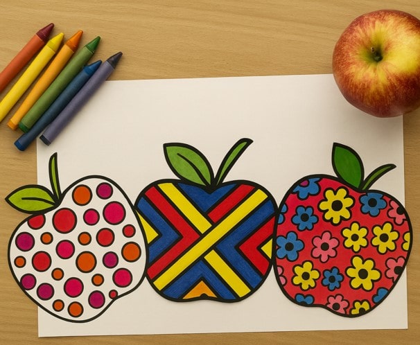 As we said before, this is an apple coloring page activity. Apples are one of the favorite fruits of children, and they are very nutritious. That’s why we created this activity with an apple theme. You can make this activity more relevant to lessons and social events. For example, you could use this activity to introduce colors in a lesson, introduce patterns, during apple season, or during Thanksgiving. So let’s see what these apple coloring pages are all about.