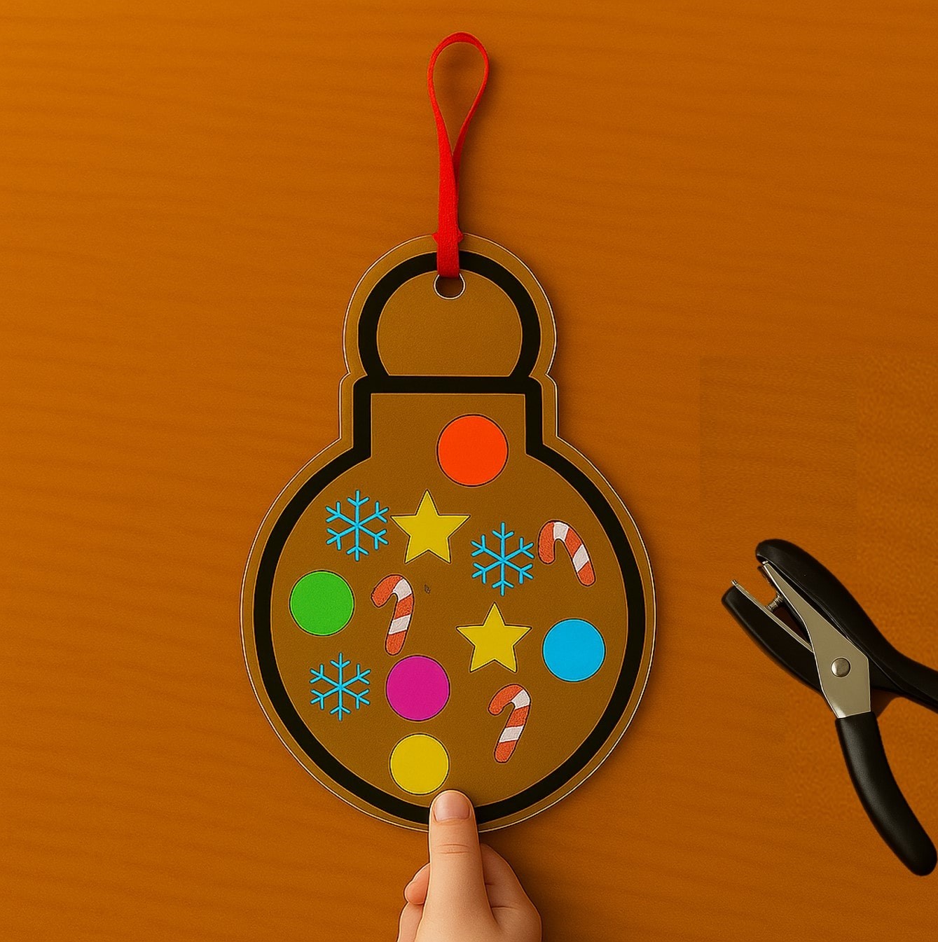 Punch a hole in the marked spot. Thread yarn, ribbon, or string through it. Now your ornament is ready to hang and decorate your classroom or home!