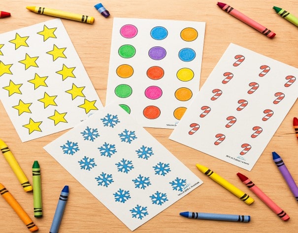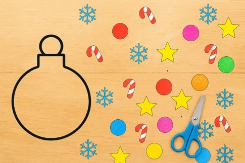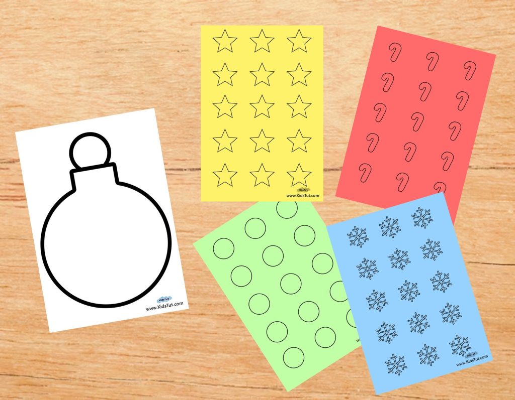 Choose your favorite ornament shape and print it on white paper. Then print the shape templates (stars, circles, etc.) on colored paper. You can also print them on white paper and let kids color them later.