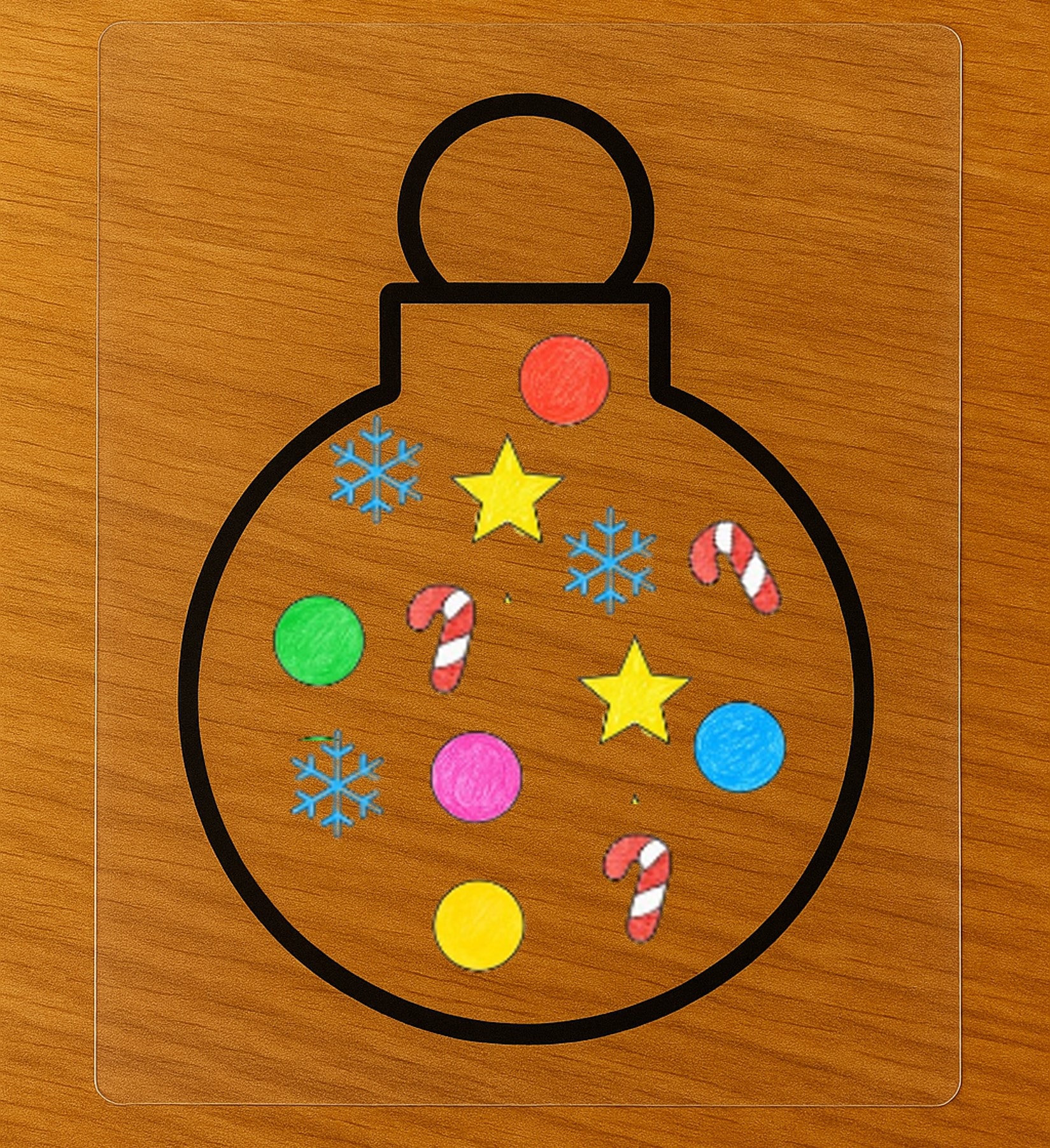 Stick the colored shapes inside the ornament outline on the clear surface. Use glue or double-sided tape to arrange them however you like.