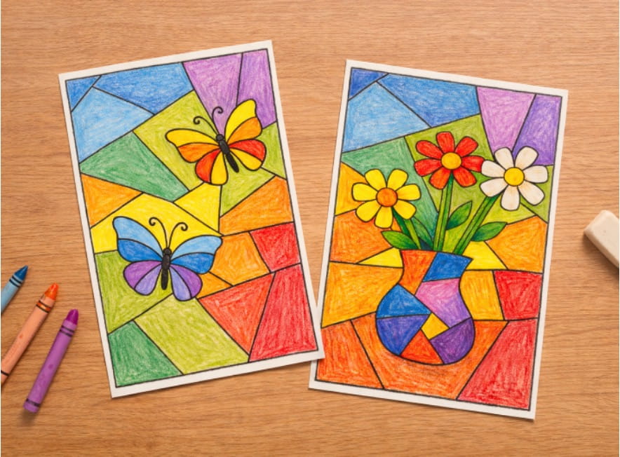 Step 01: Color with crayons or markers Fill the shapes with bright colors using crayons, markers, or colored pencils.