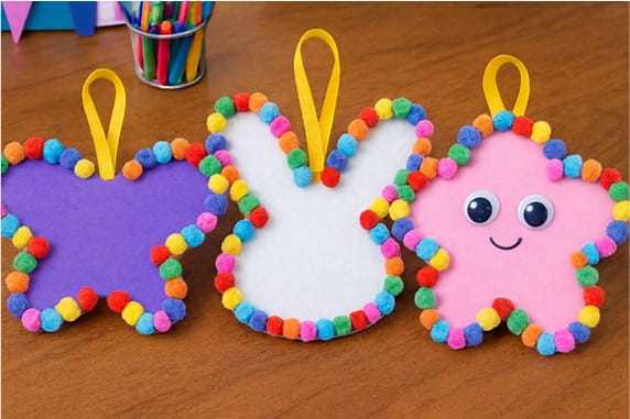 This craft is bright, fun, and super easy! Kids can turn simple shapes like butterflies, bunnies, or stars into colorful decorations using pom‑poms, glitter, and ribbons. It’s a cheerful project that makes perfect hanging ornaments for classrooms, bedrooms, or parties.