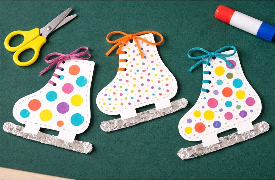 This winter craft is super easy and colorful. You’ll use paper, foil, yarn, crayons, paints, and a Popsicle stick to make your own pretend skates. They look shiny and cool—just like real ones! Grab your scissors and glue, and let’s get crafting!