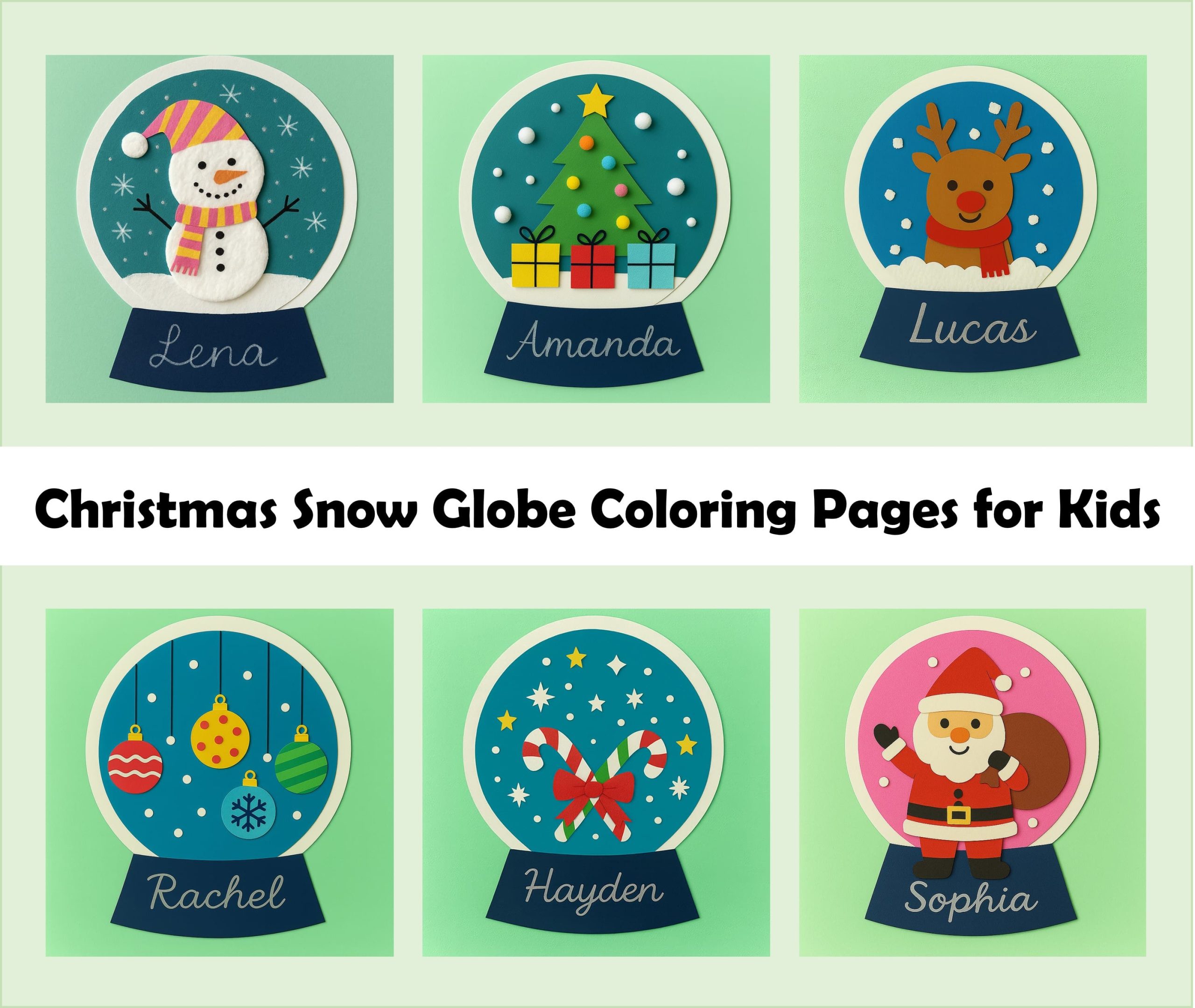 Celebrate the season with these adorable snow globe coloring pages! Each globe features a festive holiday scene—like Santa, snowmen, reindeer, and candy canes—plus a name label for personalization. These pages are perfect for kids to color, cut, and display as holiday decorations, classroom crafts, or handmade cards. Simple enough for young learners, and fun for all ages!