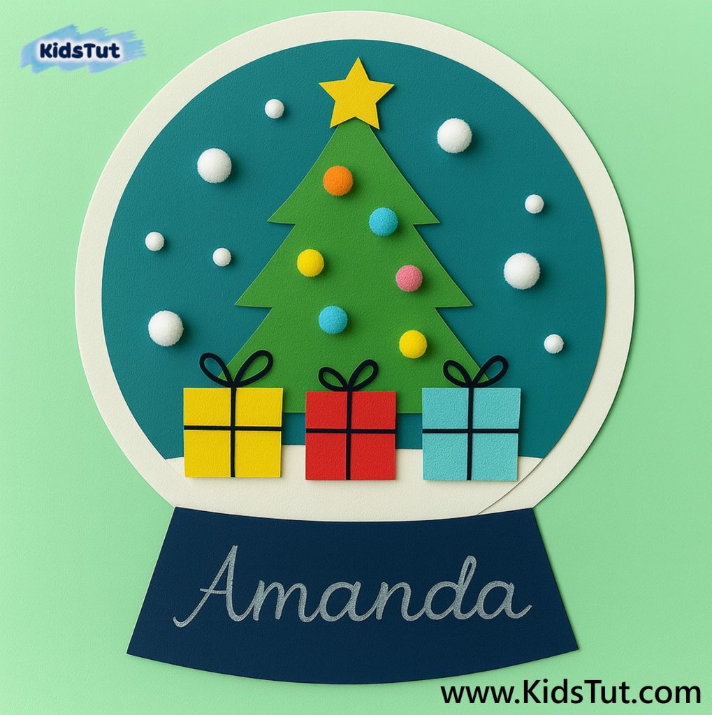 First, print, color, and cut the given templates. Then paste the Christmas tree and gift boxes onto your globe. Next, take a few pom‑pom balls and paste them on your Christmas tree and in the background.
