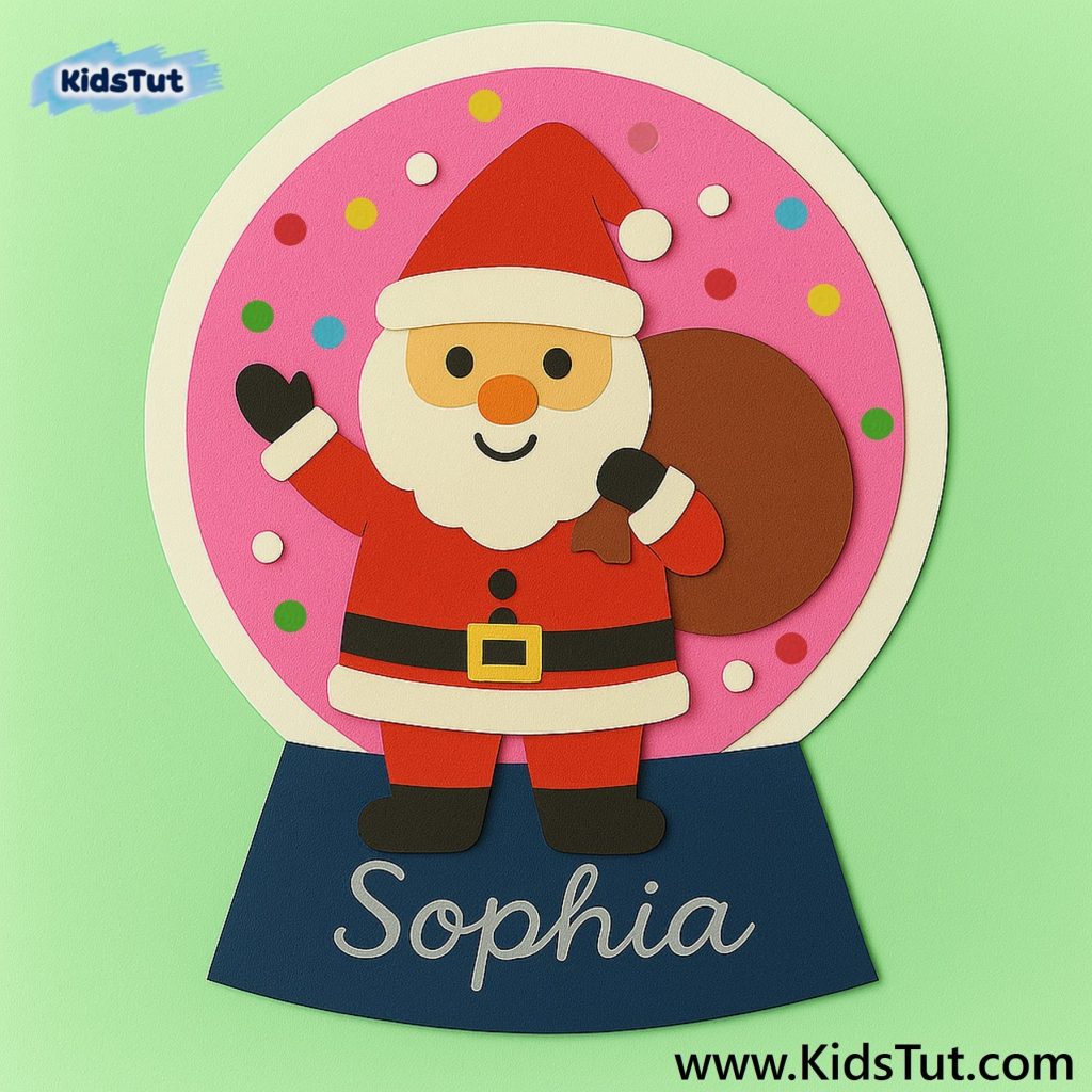 Print the given Santa image first. Then color and cut it out. Next, paste it onto your globe. Finally, paste some dot stickers on the globe background.