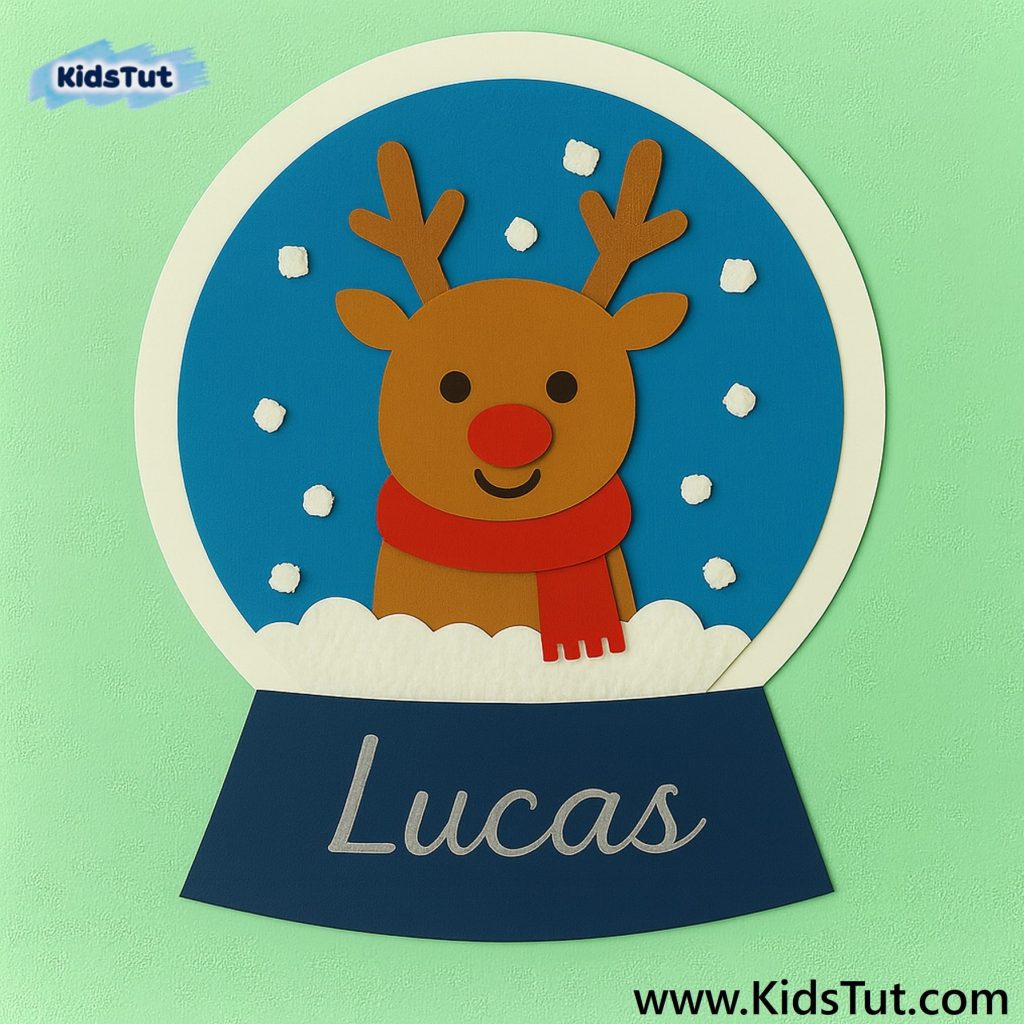 Here you have to print the reindeer template. Then color and cut it out. Paste your cut-out reindeer onto the globe. Now use some cotton or white paper pieces for ground snow, and paste them at the bottom of the globe to cover the reindeer’s bottom part. Finally, cut out cotton pad pieces, white dot stickers, or use cotton, and paste them around the reindeer.