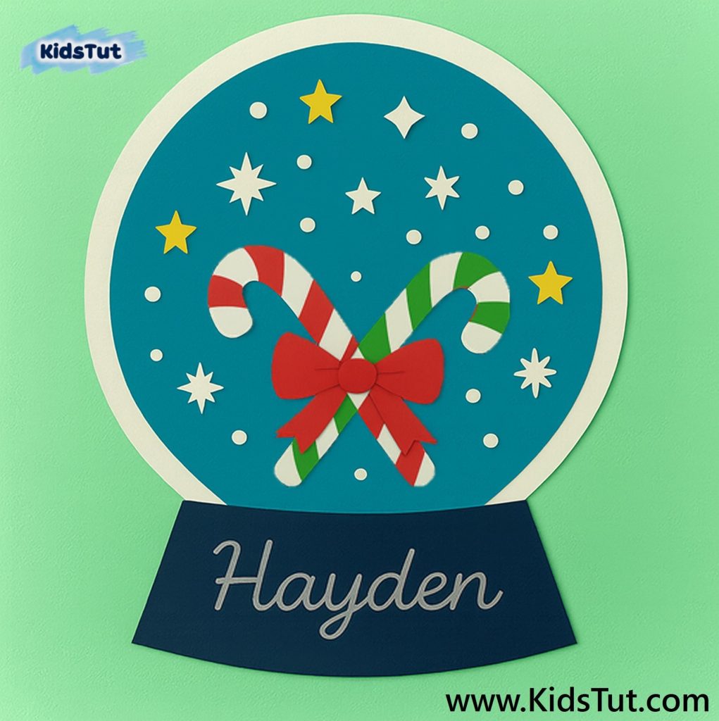 Print, color, and cut the given candy cane templates. Then paste them onto your globe. Now take star stickers, dot stickers, and other Christmas-related stickers, and paste them around the candy cane image.