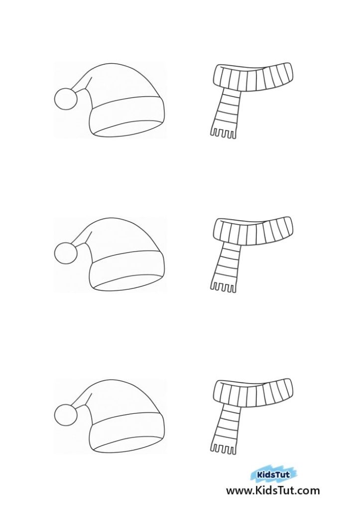 Draw with white paint or white crayons, or paste cut-out paper pieces as floor snow. Then make the snowman using 2 cotton pads. Paste them on the floor snow parts you made. Next, print, color, and cut out the given templates below. Now paste them in the matching places on the snowman. Finally, draw the snowman’s features and surrounding snowflakes with a marker.