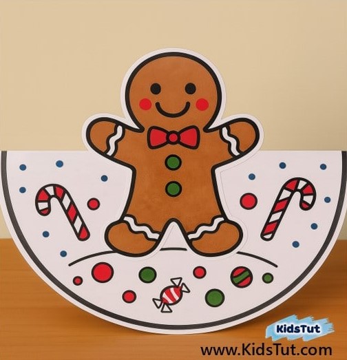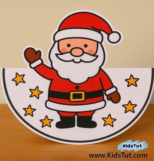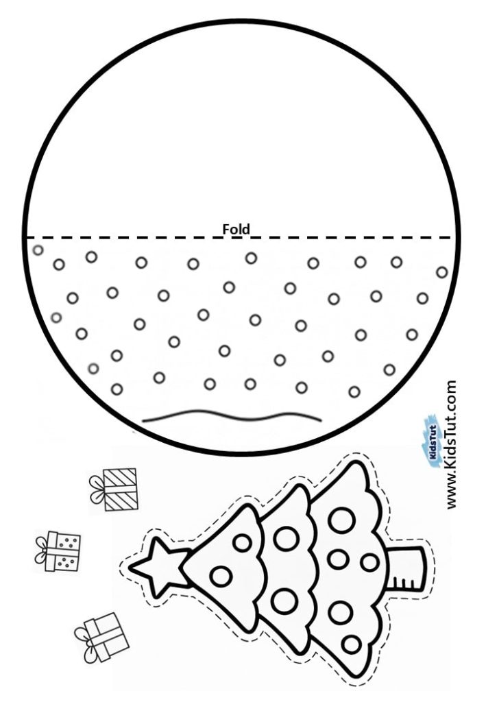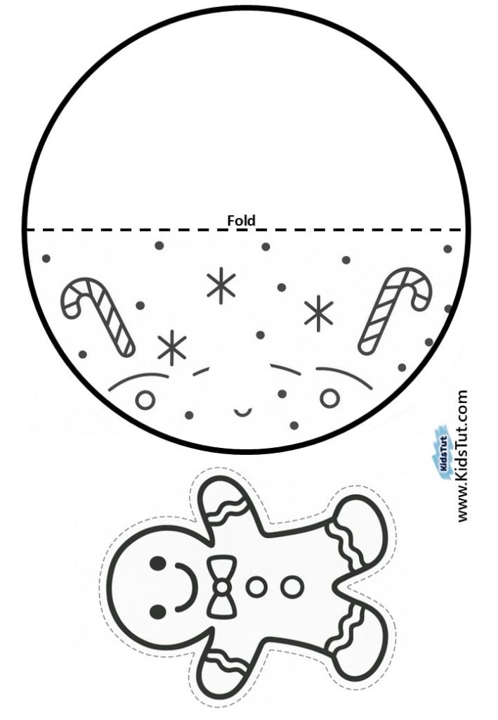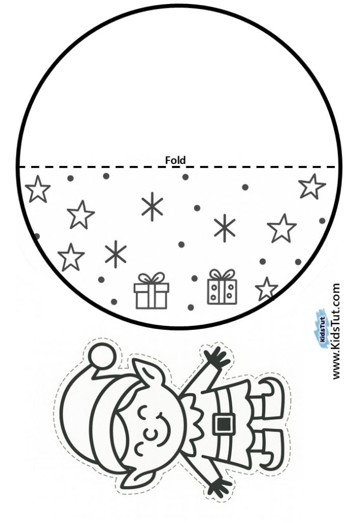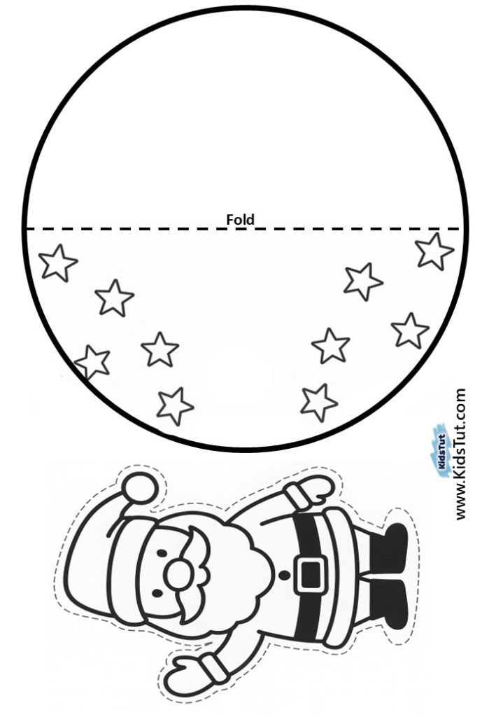 - Take your decorated circle and fold it along the dashed line to make a half‑circle. Now, take your Christmas character and glue it onto the decorated half‑circle side. Press gently so it sticks well.