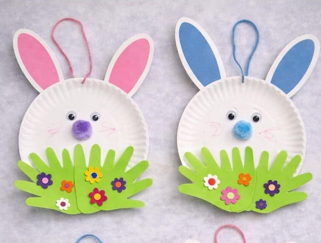 - Attach a yarn loop at the top of the plate and hang your bunny craft.