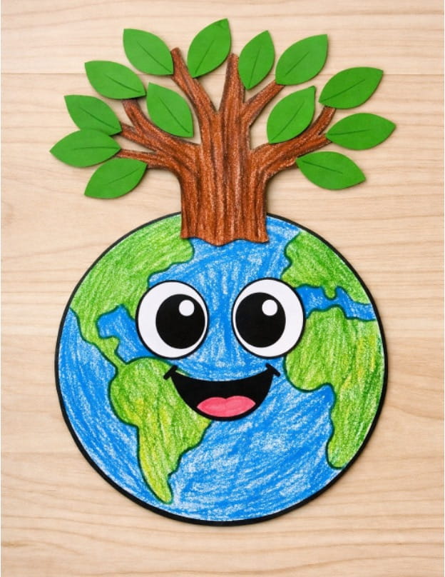 Earth Day is all about showing love to our planet. This craft helps kids learn why trees are important while making a fun Earth and tree decoration. With coloring, cutting, and pasting, children can create a smiling Earth with a growing tree on top. It’s a playful way to teach how trees help keep our Earth healthy and happy.