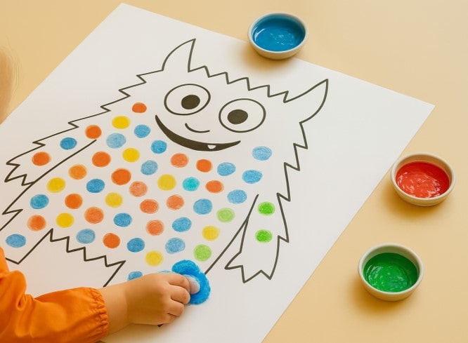 - Step 03: Let kids dip cotton swabs into the paint and dab colorful dots onto the monster image.