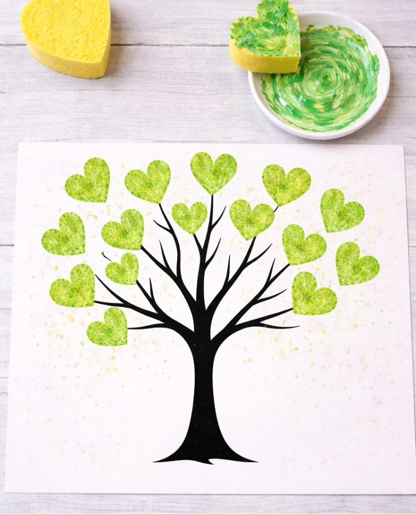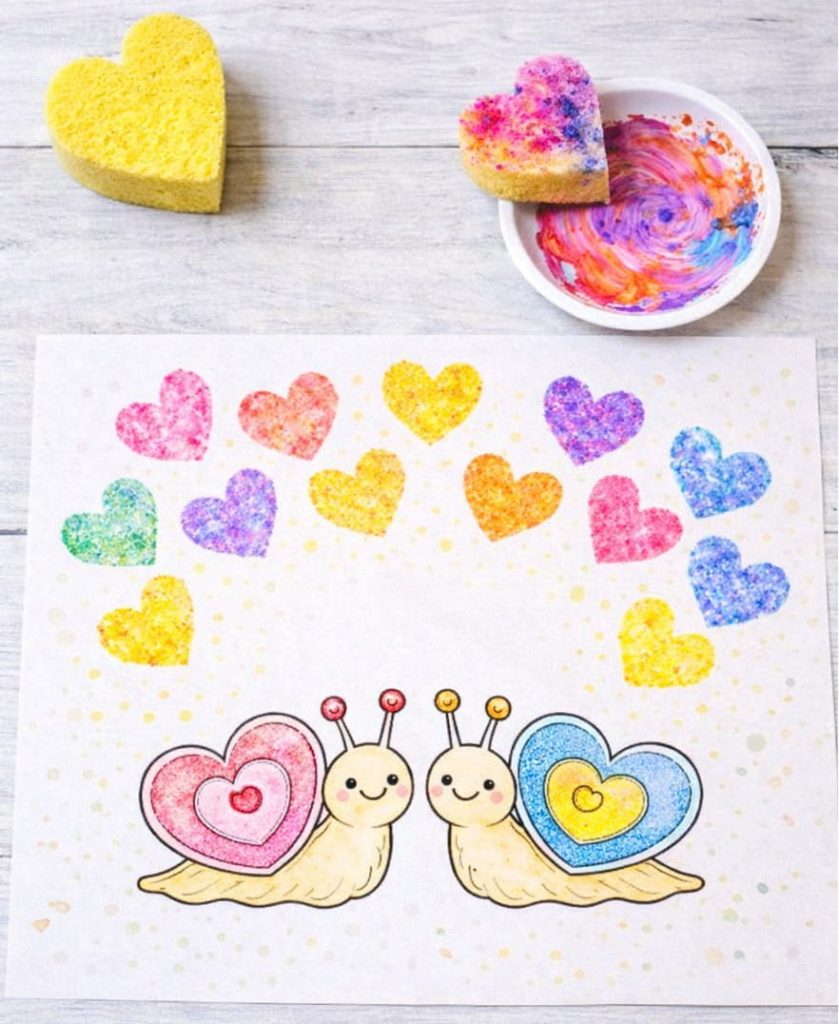 - Dip the heart-shaped sponge into the paint, then stamp it onto your template to make heart prints.