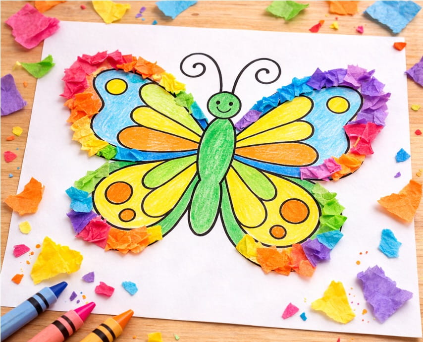 Spring is full of bright colors and happy shapes! With this craft, kids can make butterflies, flowers, trees, tulips, rainbows, umbrellas, or even Easter eggs. Each design becomes extra special when decorated with rainbow tissue paper. It’s simple, fun, and perfect for spring decorations at home or school.