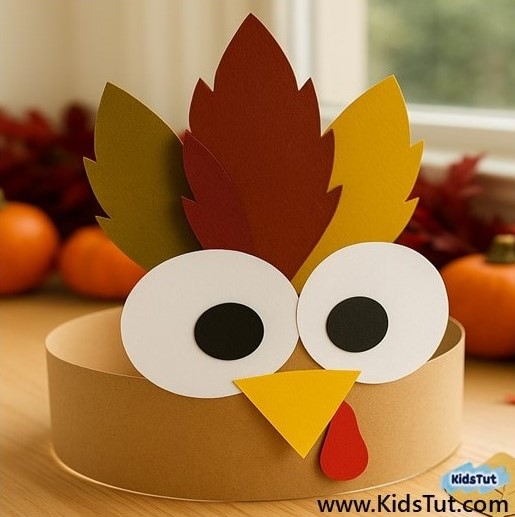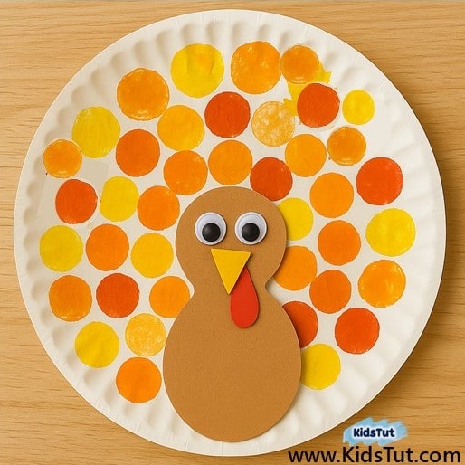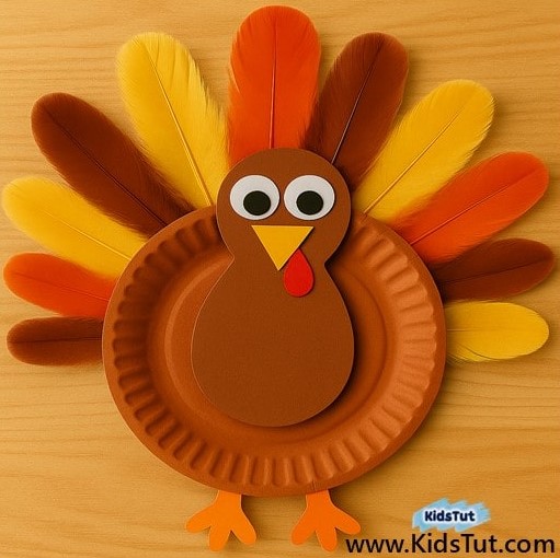 • Step 03: Cut two white circles and two smaller black circles for the eyes. Glue the black circles onto the white ones, then attach them to the turkey’s face. Step 04: Cut a yellow triangle for the beak and a red teardrop shape for the wattle. Glue both below the eyes. Step 05: Glue colorful feathers around the top half of the plate to create the turkey’s tail. Step 06: Cut out two orange feet shapes and glue them to the bottom of the plate. Step 07: Let everything dry, then display your turkey craft for Thanksgiving fun!