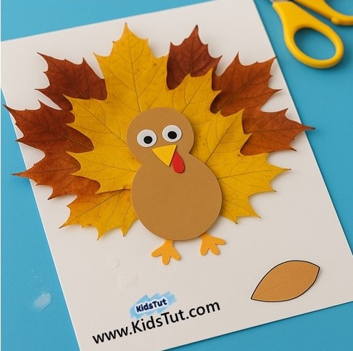 • Step 05: Arrange real autumn leaves in a fan shape behind the turkey’s body to form the tail feathers. Glue them in place.