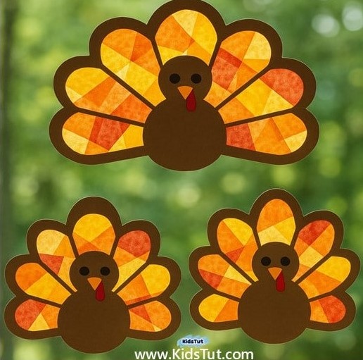• Step 01: Cut a large oval from brown paper for the turkey’s body and a smaller circle for the head. Step 02: Cut two white circles and two smaller black circles for the eyes. Glue the black circles onto the white ones, then attach them to the head.