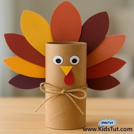 • Step 06: Tie a piece of twine or ribbon around the bottom of the roll for a cute finishing touch. Step 07: Display your turkey on a table, shelf, or classroom window for a festive fall decoration!