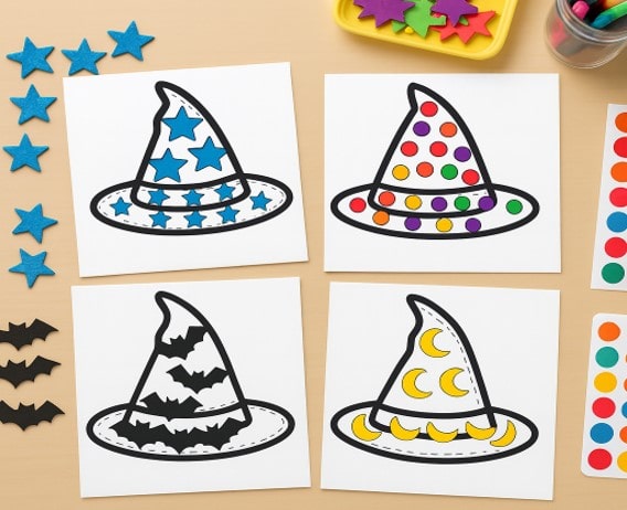 - Step 3: Take the hat templates and paste the cut-out Halloween images onto them.
