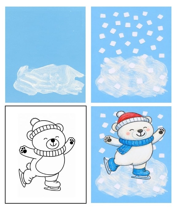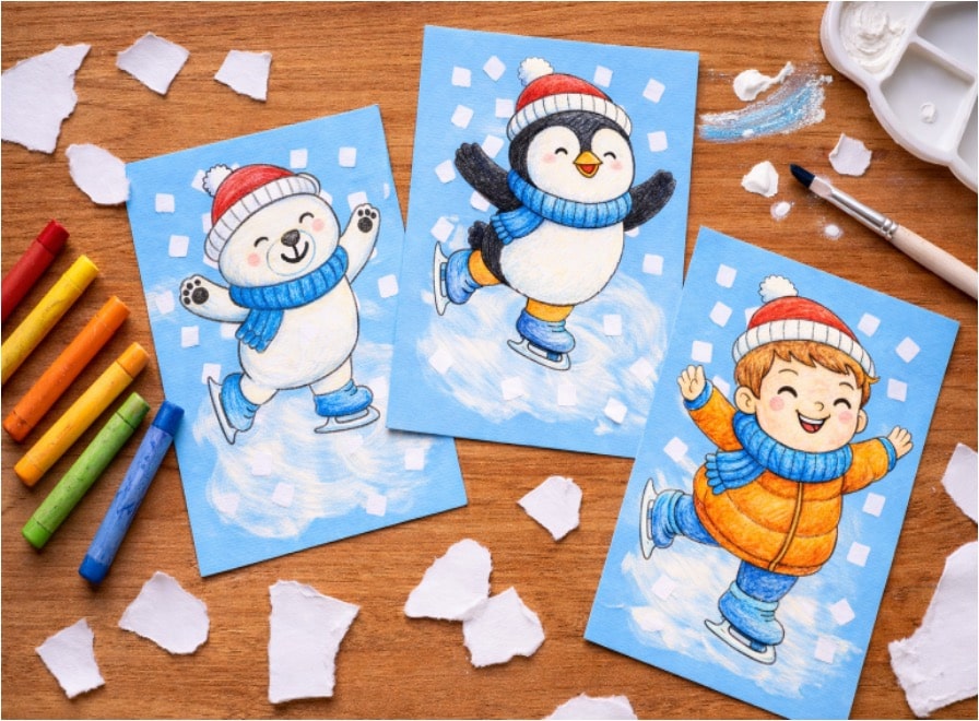 This free and fun winter craft is perfect for kids who love to draw and decorate. Using crayons, paint, or markers, children can create cute characters like polar bears, penguins, or kids skating on snowy ice. With just a few simple materials and a splash of imagination, they’ll build a joyful winter scene full of movement and sparkle. Great for classroom displays or cozy home crafting!