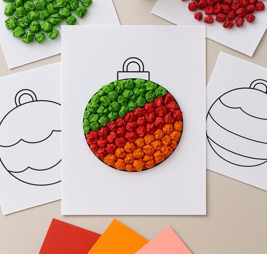 Here we have given you 10 beautiful Christmas baubles in different patterns and shapes. Similarly, those 10 different patterns of baubles come to you. Therefore, with these templates, you can create different designs and use them as coloring pages. However, in this Christmas Ornament Activity, we have planned a very beautiful decoration activity for you. Kids crumple colored paper and paste it on ornaments. It helps children’s physical and mental development as well as skill development. So let’s talk about this Christmas Ornament Activity from now on.
