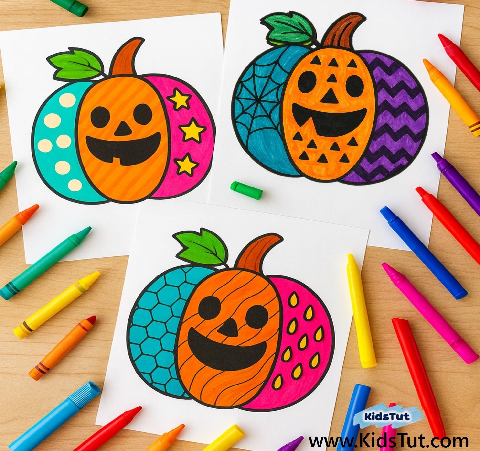 - Step 03: Color the patterned pumpkins using different colors.