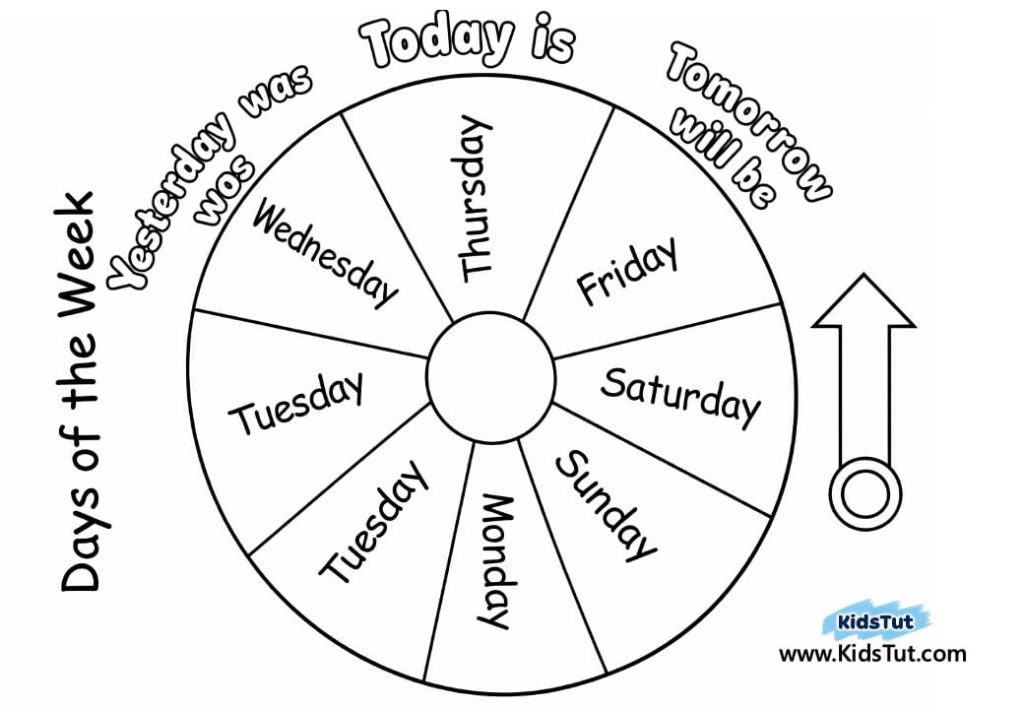 Days Chart: One week has 7 days. You can use this chart to inform children about the daily dates. Monday, Tuesday, Wednesday, Thursday, Friday, Saturday, and Sunday are represented by words in colored arc segments. Also, this allows you to introduce the day before, today, and the day after.