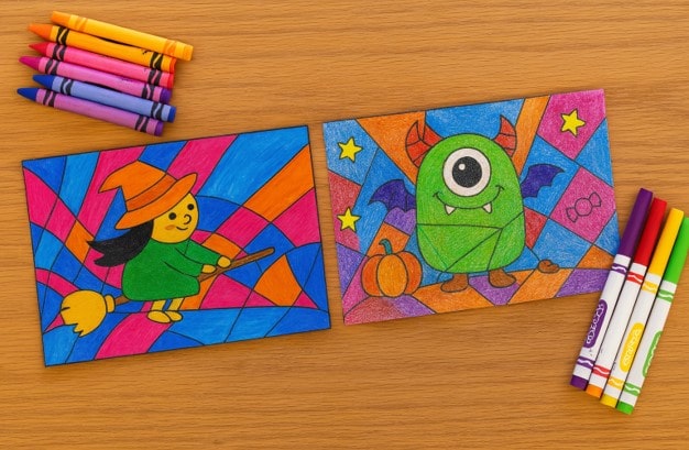- Collect the finished pages and bind them to make a Halloween coloring book.
