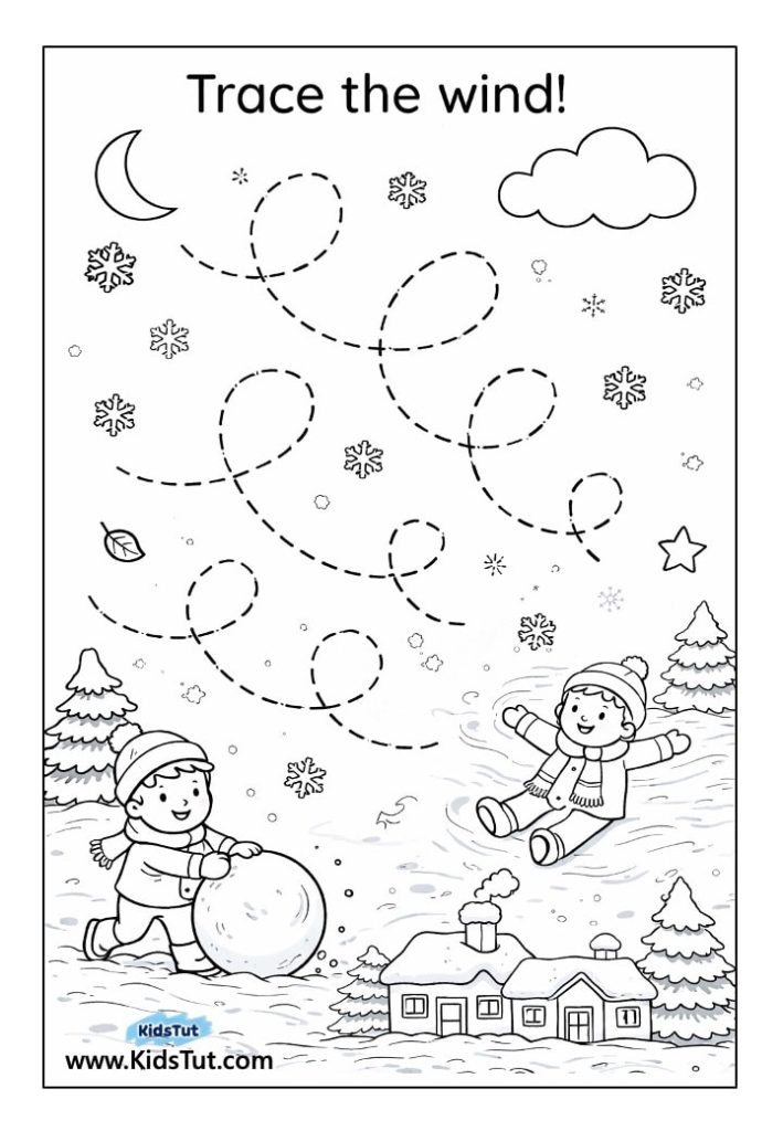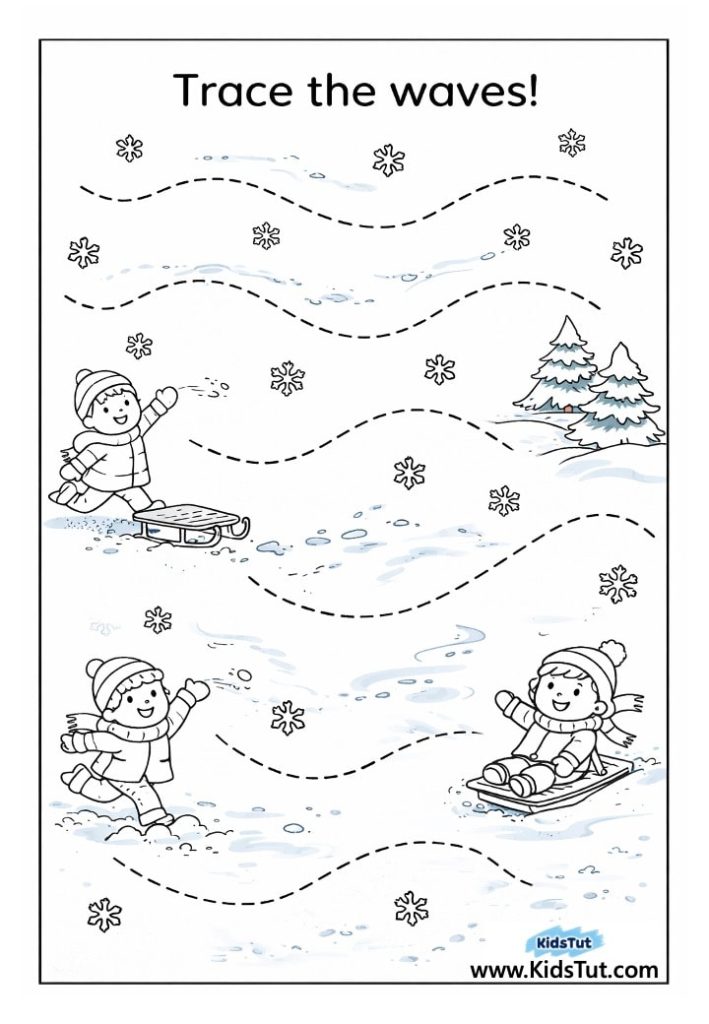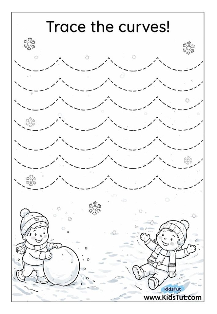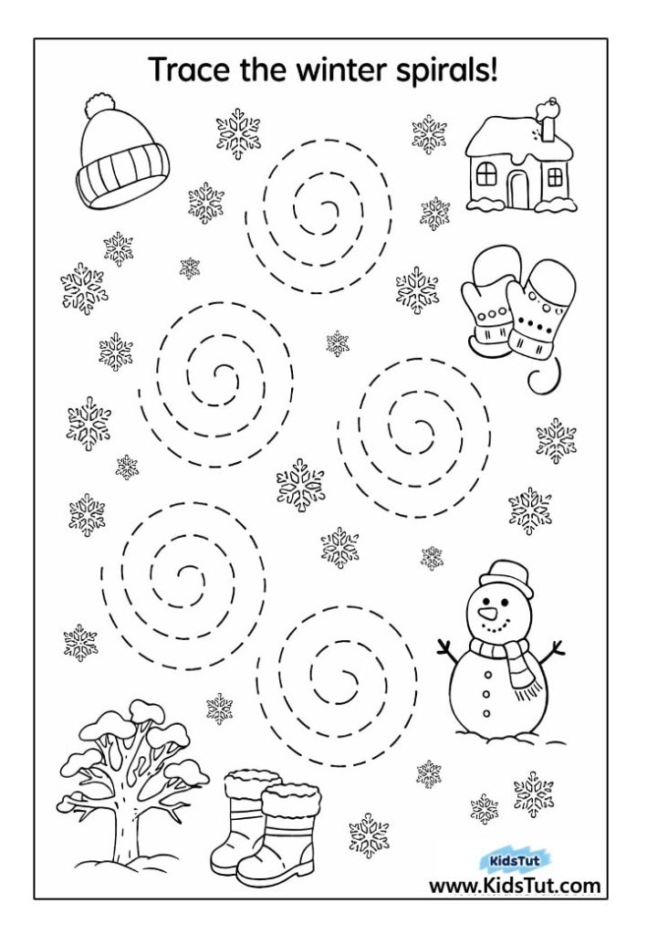 This free winter tracing worksheet is perfect for little hands. Kids can follow the spiral lines to build fine motor skills and get ready for writing. With fun winter pictures like hats, snowflakes, and boots, tracing becomes a playful activity! It’s a great way to help children practice focus, hand control, and pencil grip—all while enjoying a cozy winter theme.