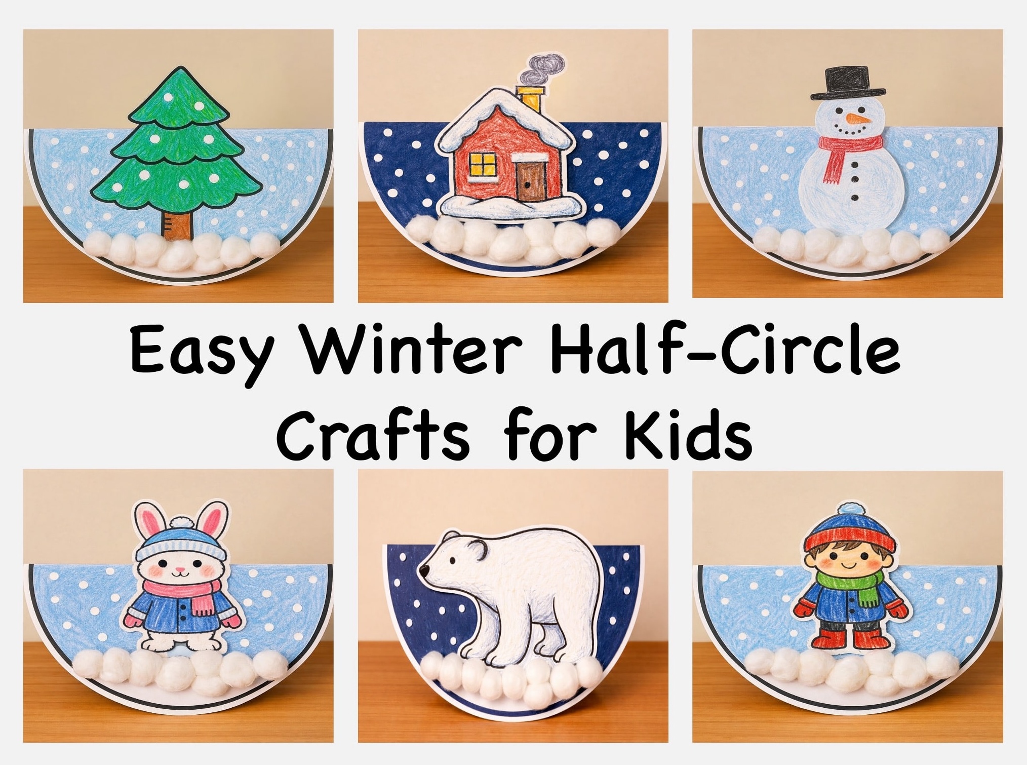 These easy winter crafts are perfect for kids and full of snowy charm. Each one starts with a half-circle base and turns into a cozy winter scene, like a snowman, polar bear, bunny, house, or tree. With cotton for snow and bright colors for characters, children can create their own little winter world. Great for classroom displays or holiday fun at home!