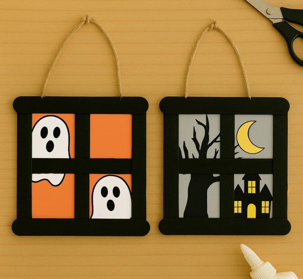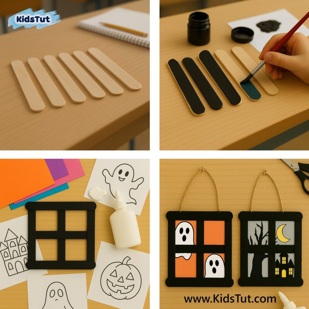 Take your cut colored paper pieces and the printed images. Paste the images onto the colored paper to create a Halloween scene. Let kids choose and arrange the images however they like. Then, glue the decorated paper behind the popsicle stick window and let it dry.