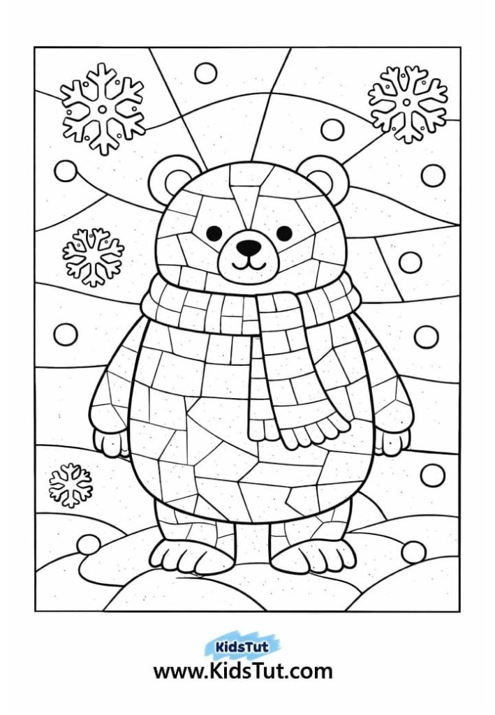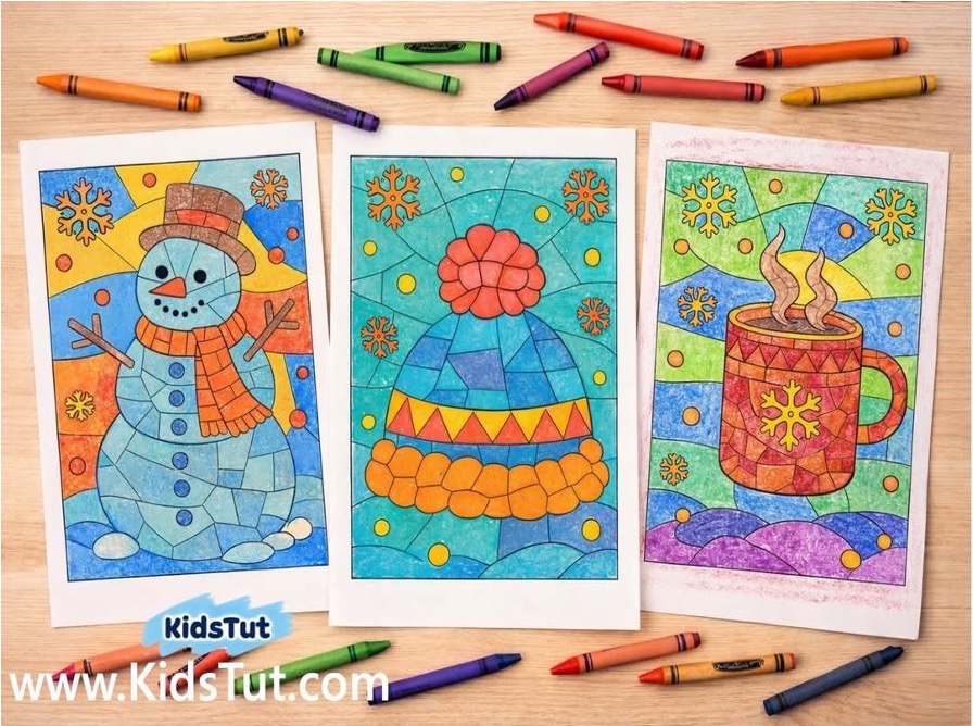 These winter mosaic coloring pages are full of cozy fun! Kids can color a snowman, a warm winter hat, or a steaming mug. all made with bold shapes and patterns that look like stained glass. They’re perfect for chilly days, classroom art time, or just relaxing at home with crayons and cocoa.